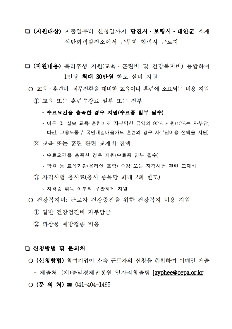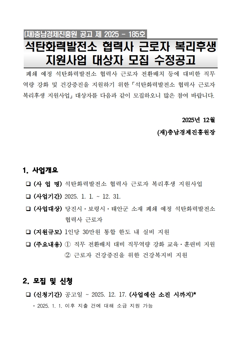 | 2025년 석탄화력발전소 협력사 근로자 복리후생 지원사업 모집 공고(수정) |