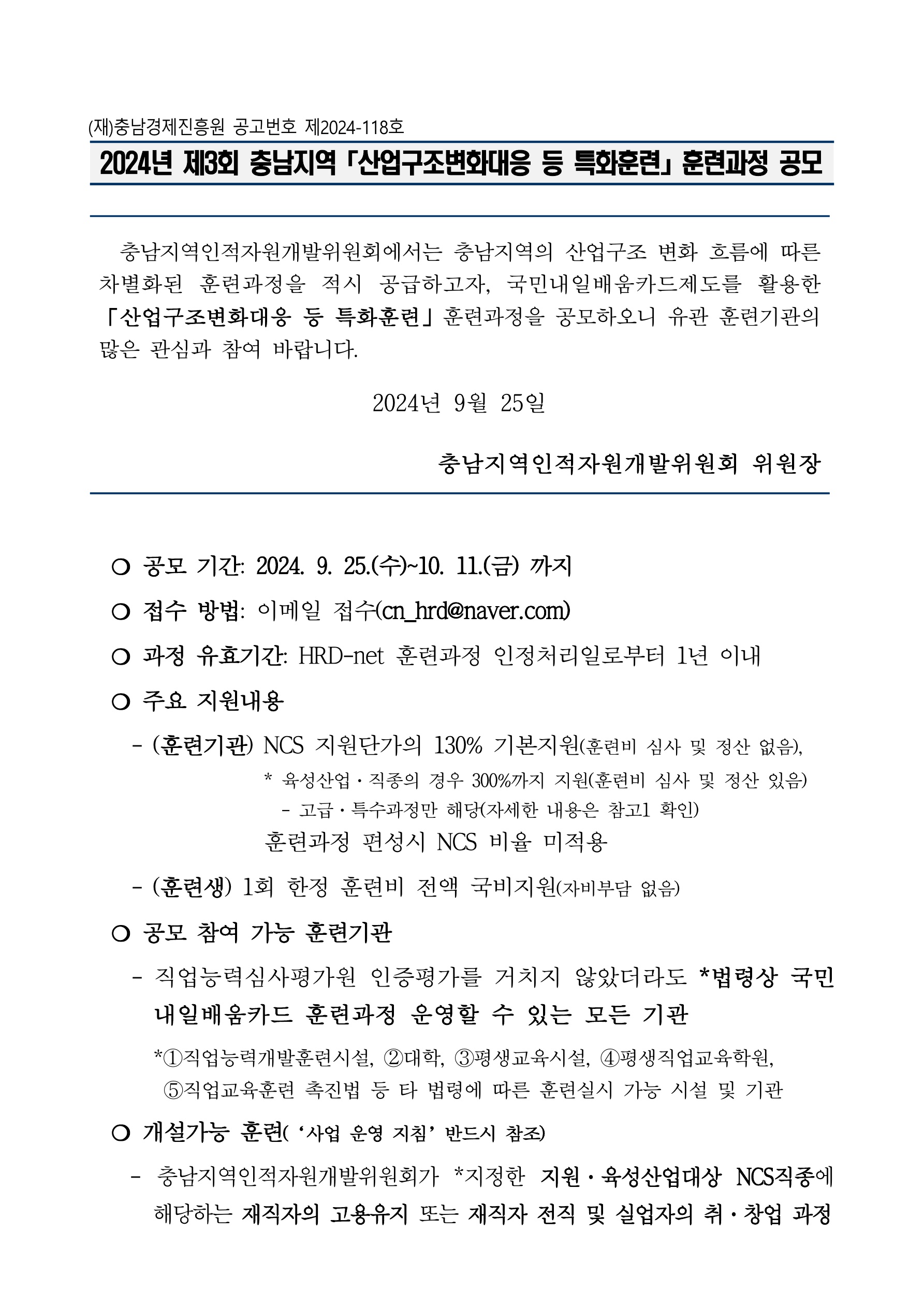 | [공고] 2024년 제3회 충남지역 「산업구조변화대응 등 특화훈련」훈련과정 공모 |