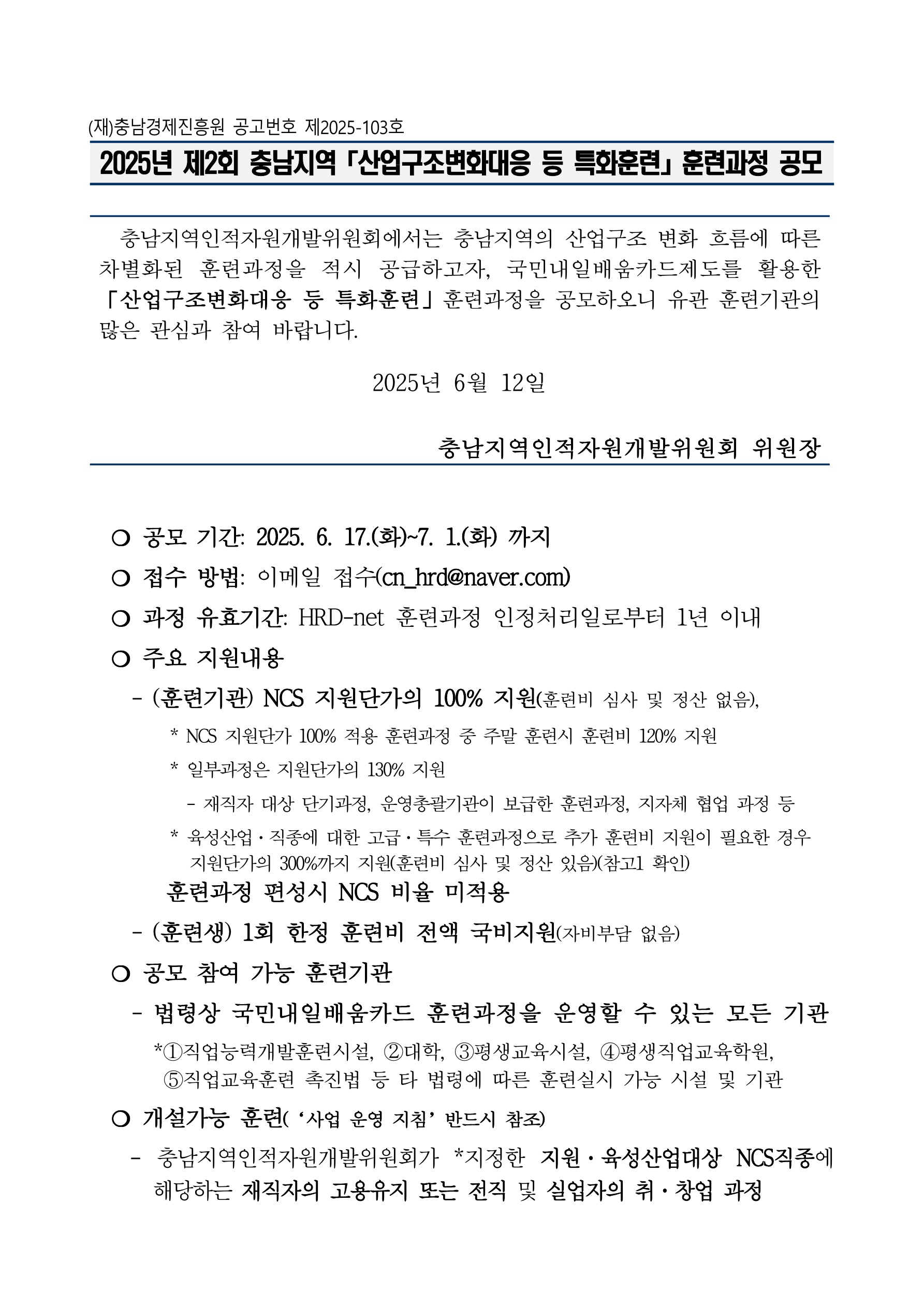 | 2025년 제2회 충남지역 「산업구조변화대응 등 특화훈련」훈련과정 공모 |