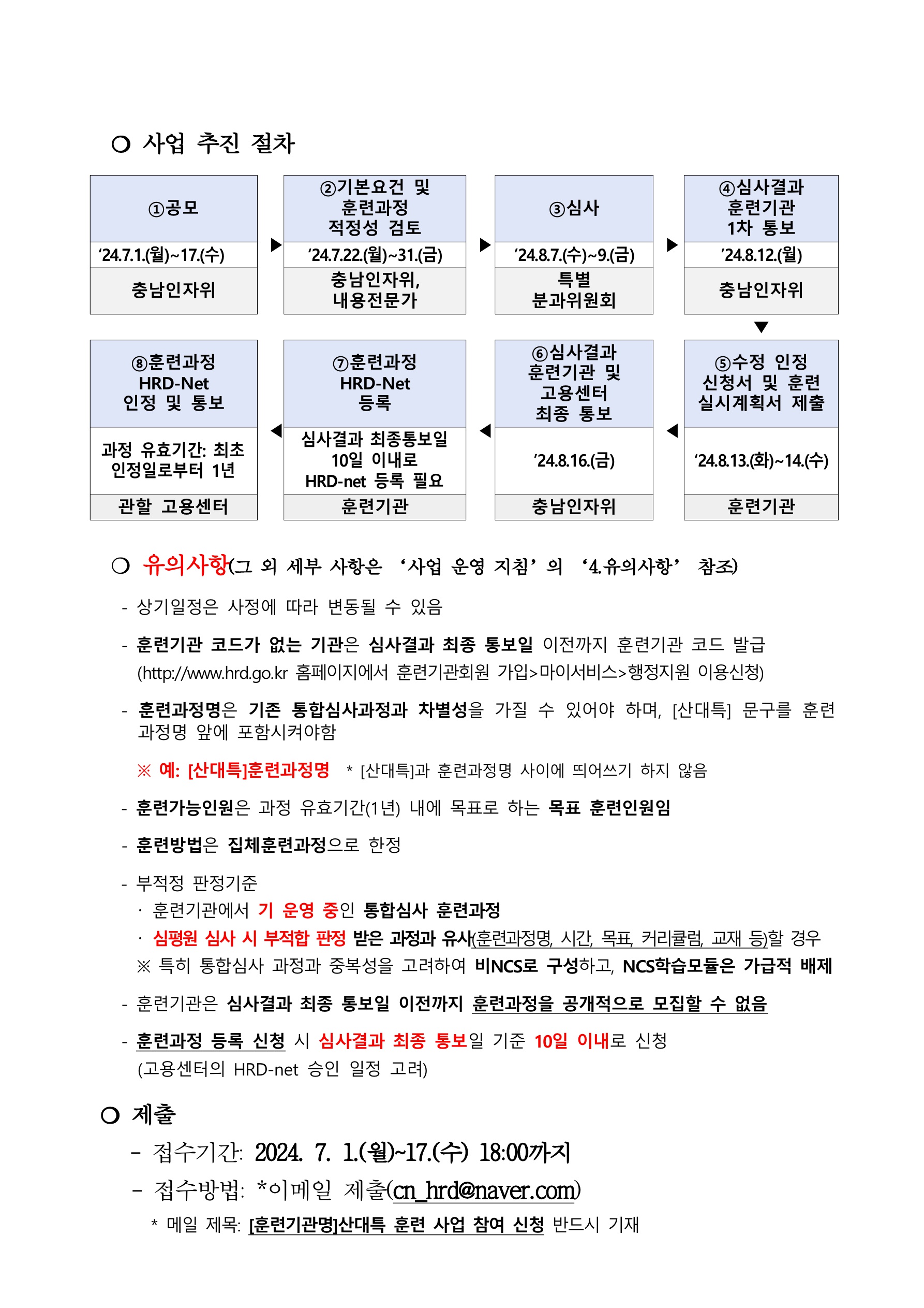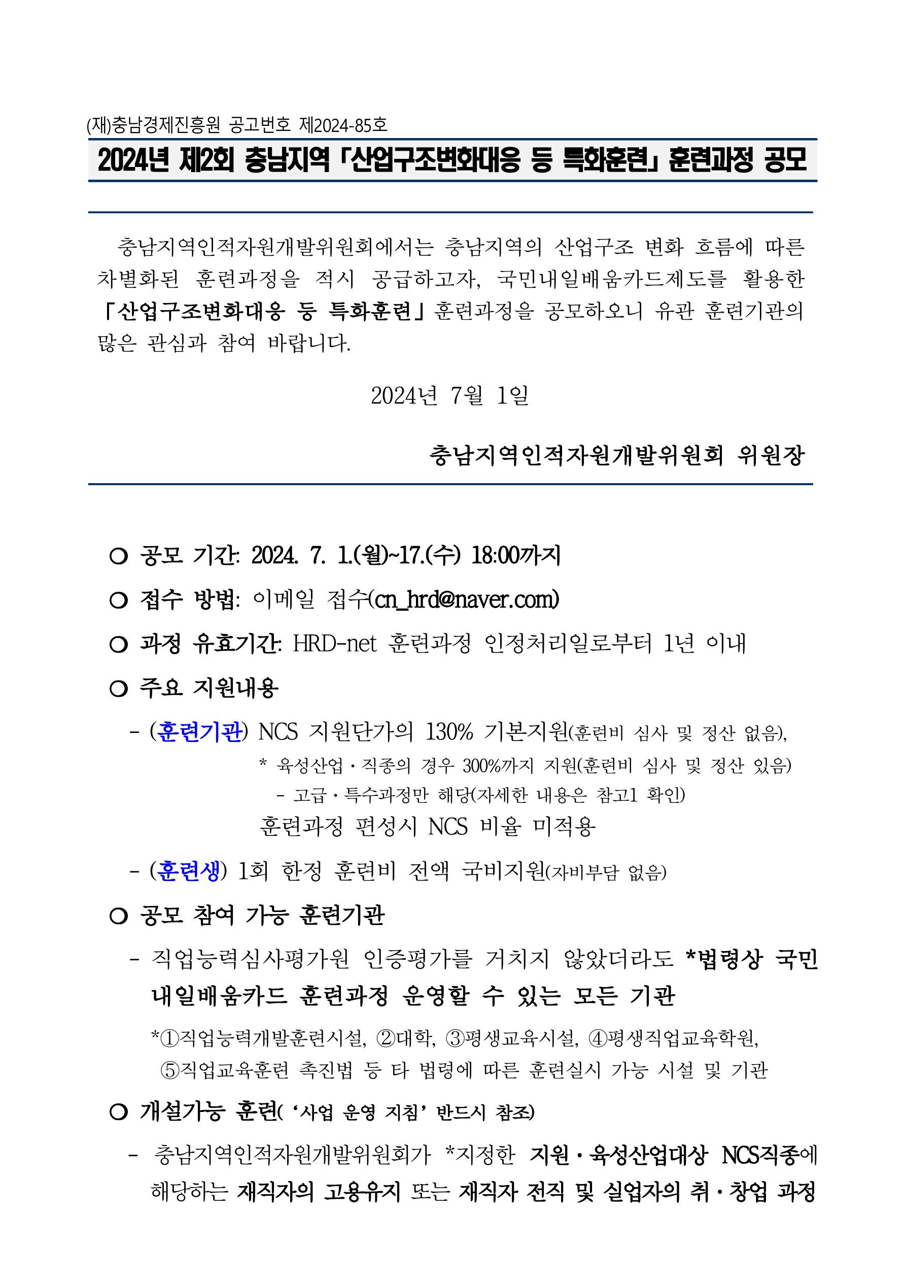 | [공고] 2024년 제2회 충남지역 「산업구조변화대응 등 특화훈련」훈련과정 공모 |