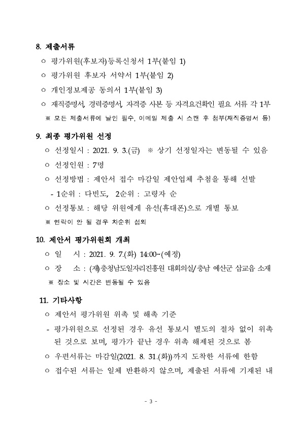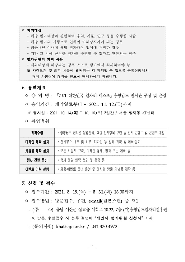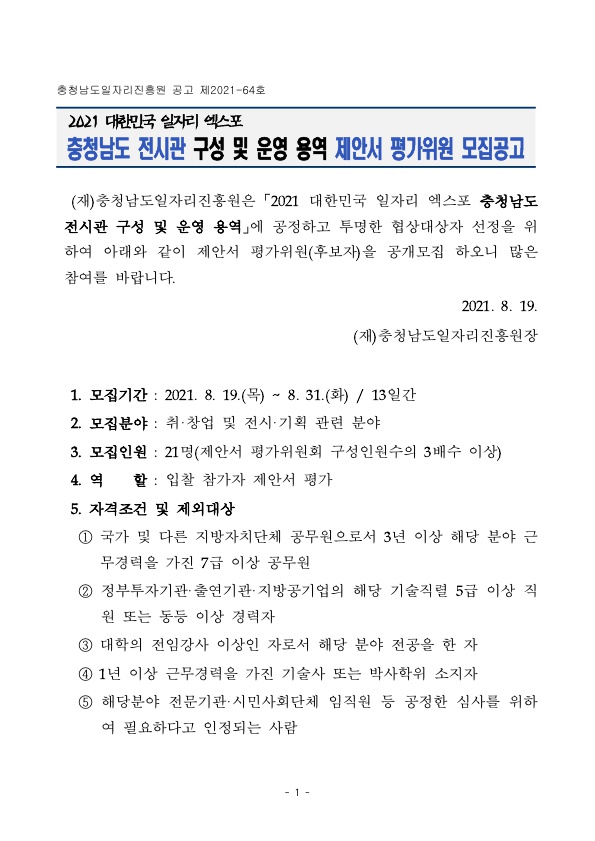 | 2021 대한민국 일자리 엑스포 충청남도 전시관 구성 및 운영 용역 제안서 평가위원 모집공고 |