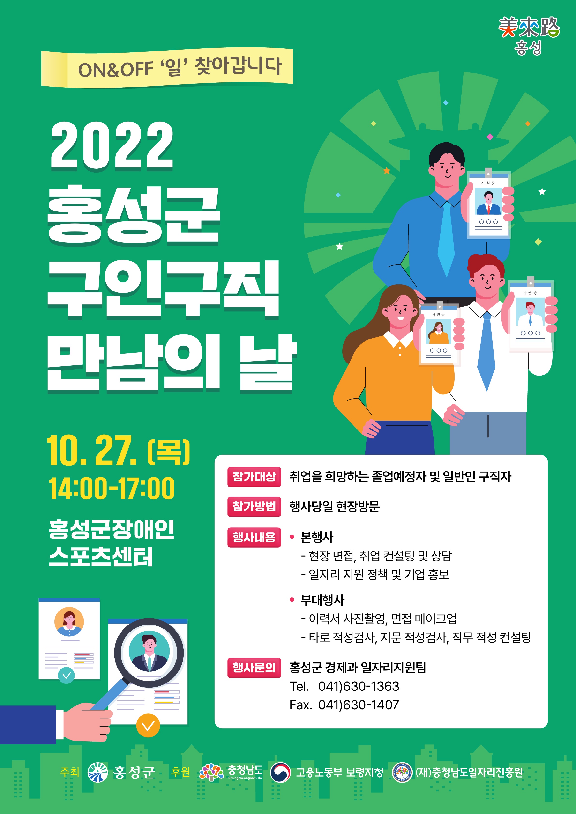 충청남도는 취업을 희망하는 구직자들을 대상으로 다양한 채용박람회를 개최하고 있습니다. 분야별로 청년들이 원하는 채용 정보와 면접 기회를 제공하고 이미지 메이킹, 서류 작성, 컨설팅 등 취업에 필요한 서비스도 함께 체험할 수 있습니다.