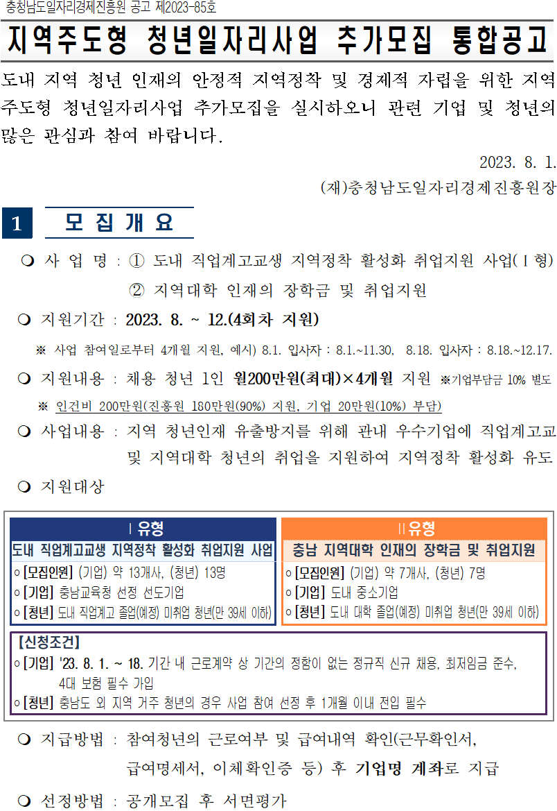 충남형 지역균형발전 청년고용 사업(Ⅰ형, Ⅱ형)