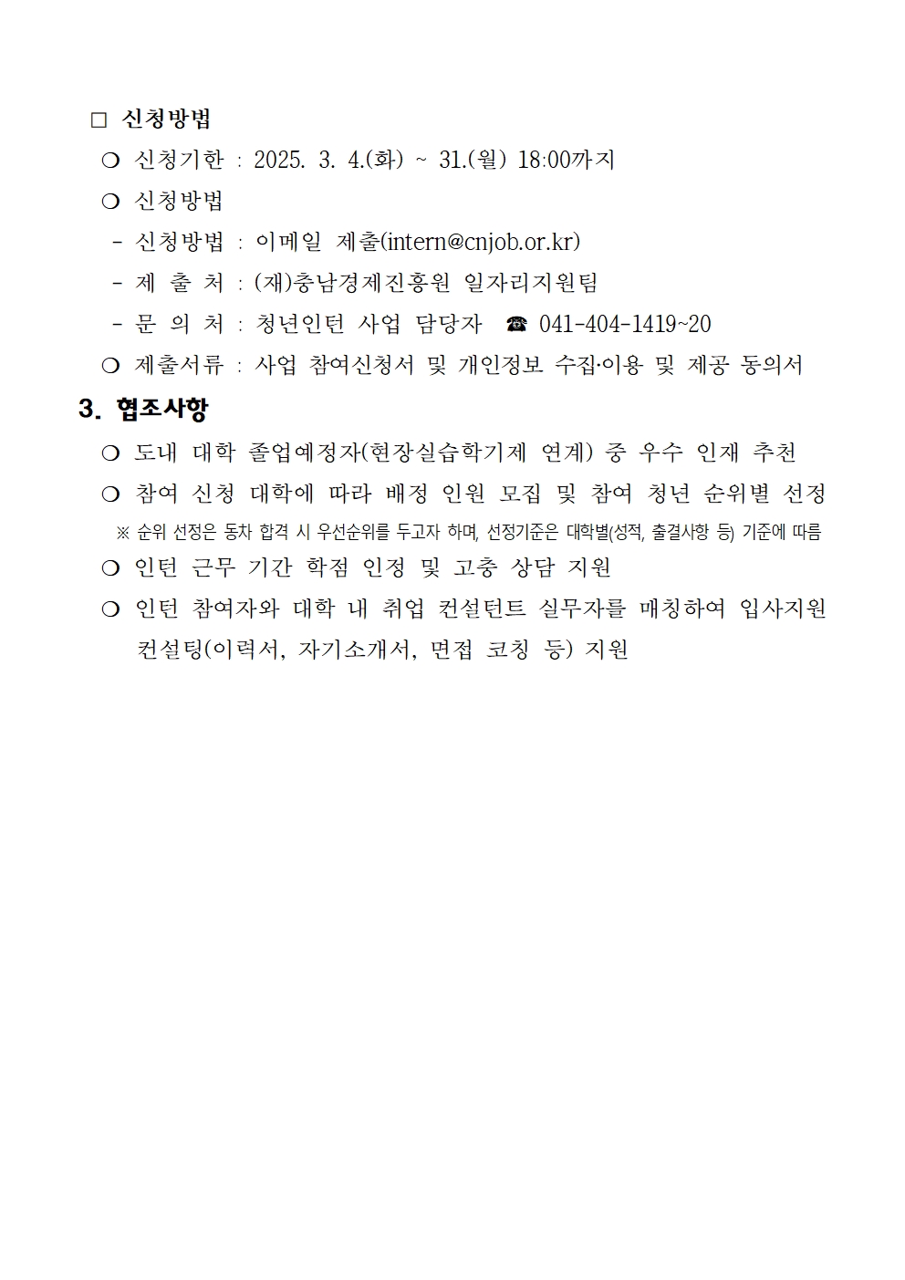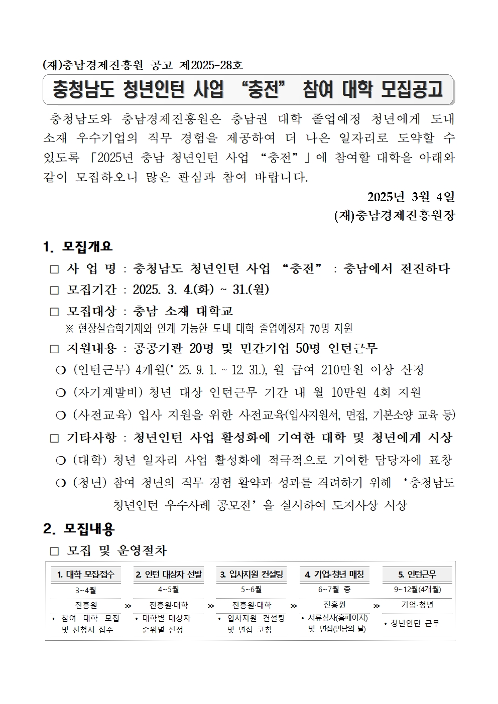 | 2025년 충청남도 청년인턴 사업 "충전" 참여 대학 모집 공고 |