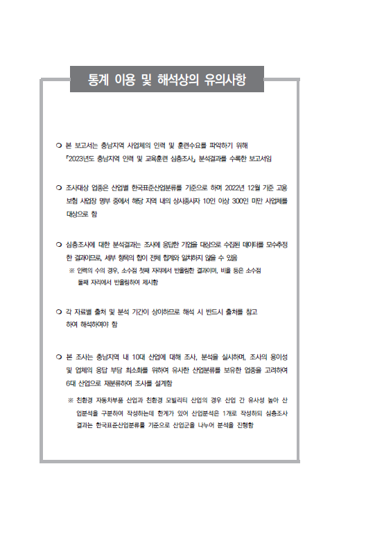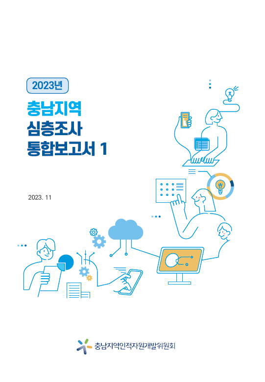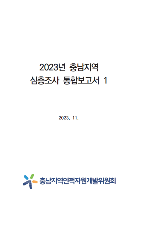 2023년 충남지역 심층조사 통합보고서 1권입니다. 원본 자료요청 또는 보고서에 관한 문의사항은 아래 연락처로 연락주시면 감사하겠습니다. 문의 : 충남경제진흥원(충남지역인적자원개발위원회) 이창행 주임연구원(☎ 041-404-1393, e-mail : haeng@cepa.or.kr)