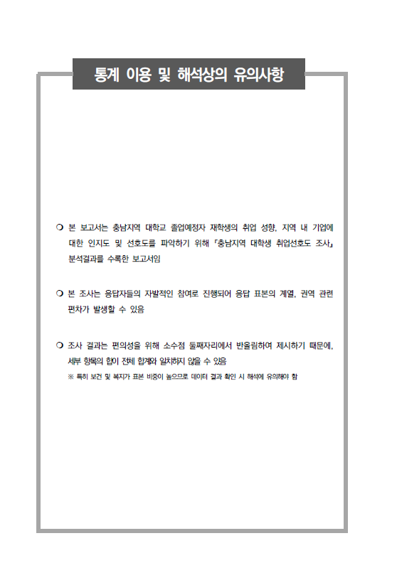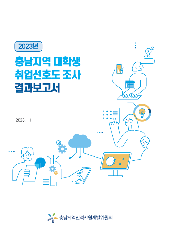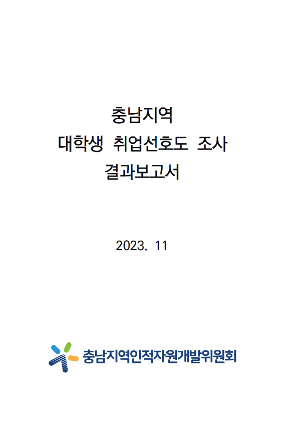 2023년 충남지역 대학생 취업선호도 조사 보고서입니다. 원본 자료요청 또는 보고서에 관한 문의사항은 아래 연락처로 연락주시면 감사하겠습니다. 문의 : 충남경제진흥원(충남지역인적자원개발위원회) 이창행 주임연구원(☎ 041-404-1393, e-mail : haeng@cepa.or.kr)