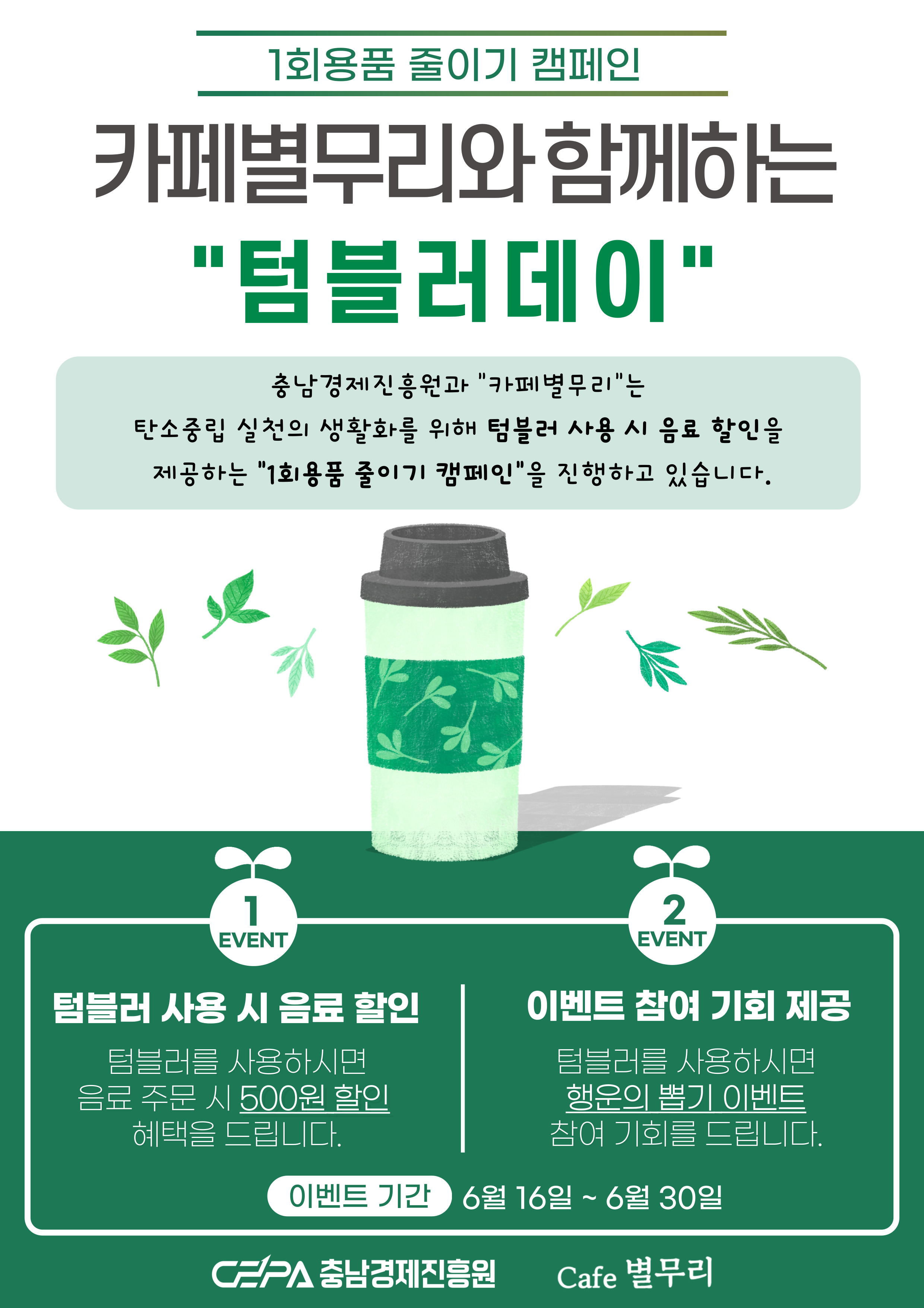 충남경제진흥원, 1회용품 제로화 캠페인 전개 - '1회용품 제로화 캠페인' 정기적 운영으로 ESG 가치 확산 박차 - 충남경제진흥원 운영 '카페별무리' 텀블러 이용 고객에 500원 할인