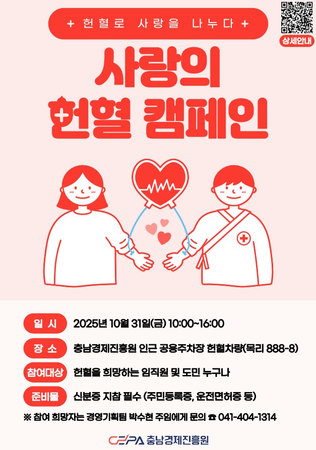 헌혈 캠페인은 대한적십자사 대전세종충남혈액원의 협조로 진흥원 인근 공용주차장(예산군 삽교읍 목리 888-8)에 이동 헌혈 차량을 배치해 운영되며, 참여 희망자는 사전 신청은 물론 캠페인 당일 현장에서도 자유롭게 접수할 수 있다. 헌혈에 참여한 이들에게는 헌혈증서가 발급되며, 다양한 기념품도 제공될 예정이다.
