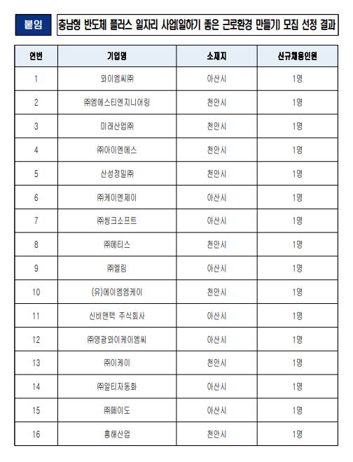 | 2025년 충남형 반도체 플러스 일자리 사업(일하기 좋은 근로환경 만들기) 모집 선정 결과 |