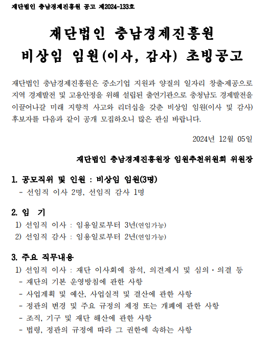 | 재단법인충남경제진흥원 비상임 임원(이사, 감사) 모집 초빙공고 |
