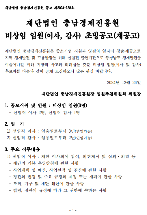| 재단법인충남경제진흥원 비상임 임원(이사, 감사) 모집 초빙공고(재공고) |