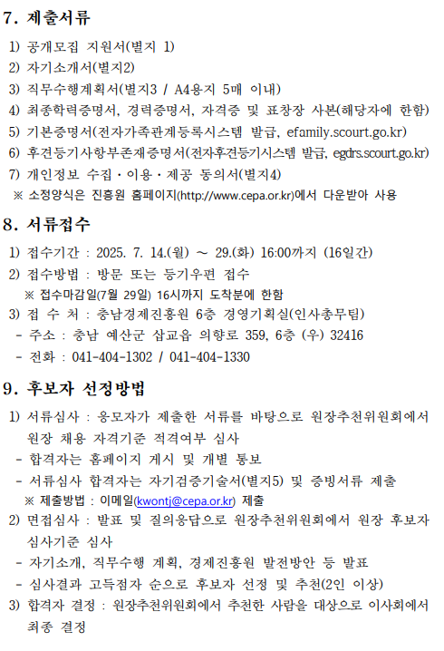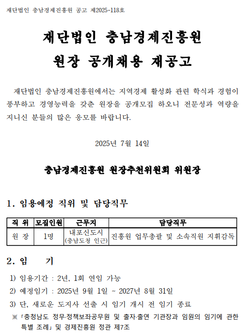 | 재단법인 충남경제진흥원 원장 공개채용 재공고 |