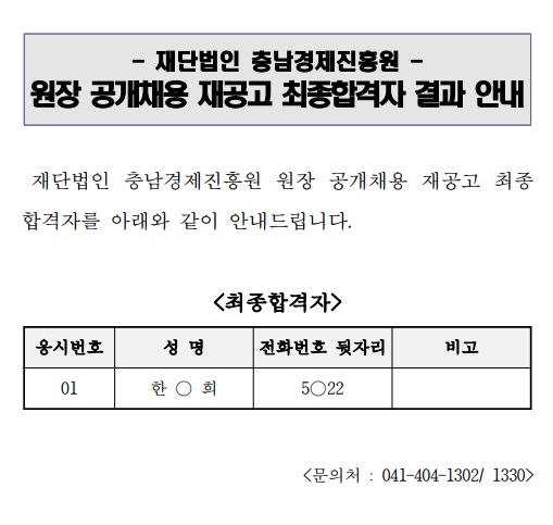 | 재단법인 충남경제진흥원 원장 공개채용 재공고 최종합격자 결과안내 |