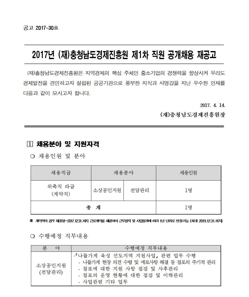 | 2017년 충청남도경제진흥원 제1차 직원 공개채용 재공고(소상공인-전담관리) |