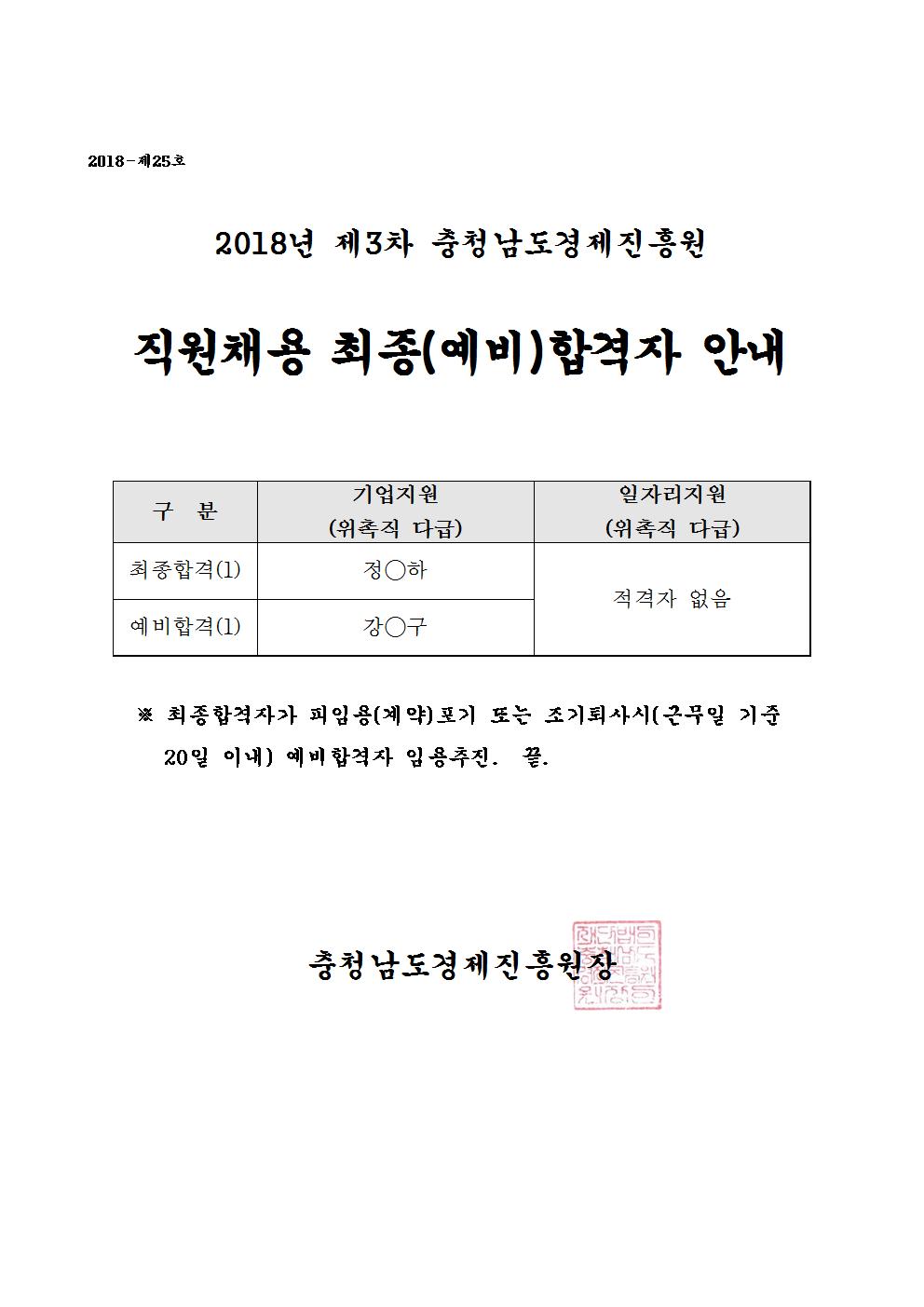 | (최종합격)2018년 (재)충청남도경제진흥원 제3차 직원채용 최종합격자 안내 |