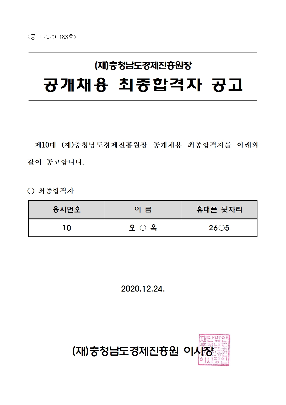 (재)충청남도경제진흥원장 공개채용 최종합격자 공고
