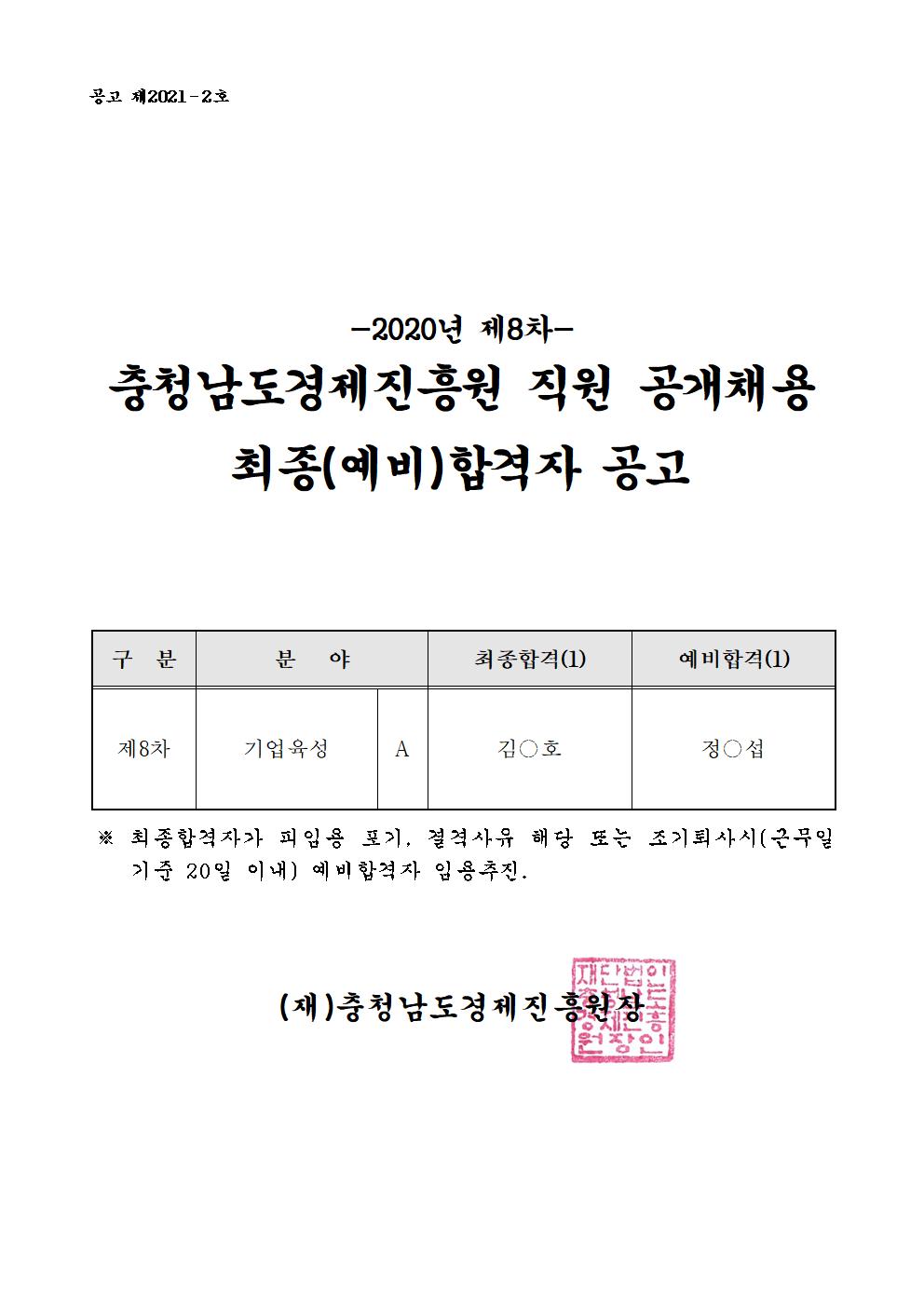 | 2020년 (재)충청남도경제진흥원 제8차 직원(계약직) 공개채용 최종(예비) 합격자 공고 |