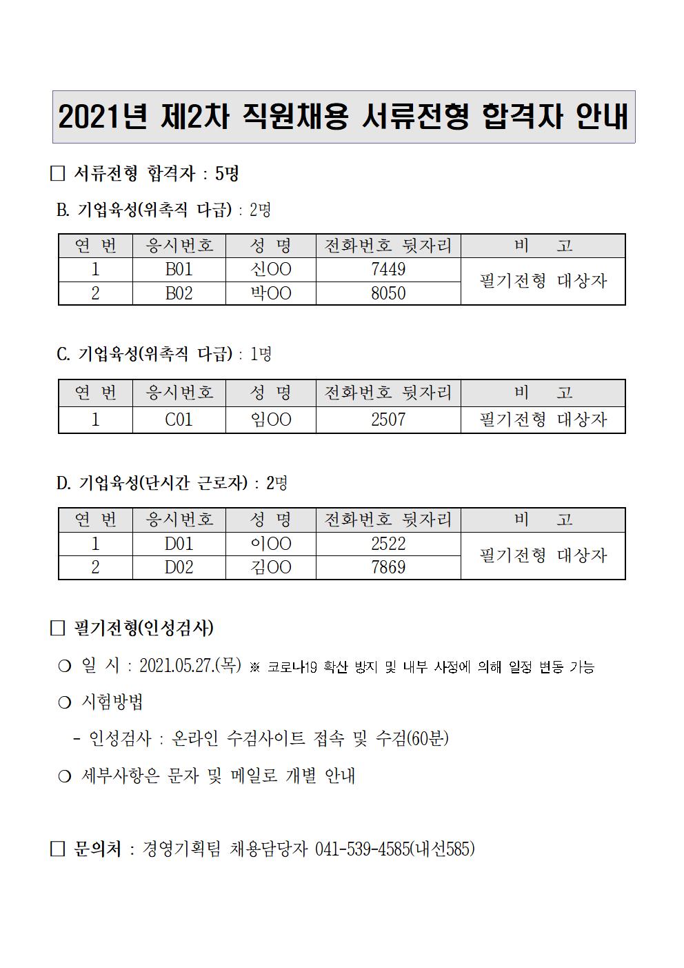 2021년 제2차 직원채용(계약직) 서류전형 합격자 안내(본공고)