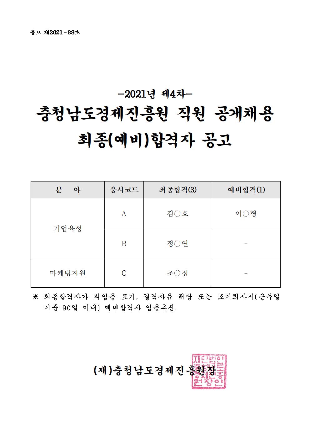 2021년 제4차 직원채용(계약직) 최종(예비)합격자 공고