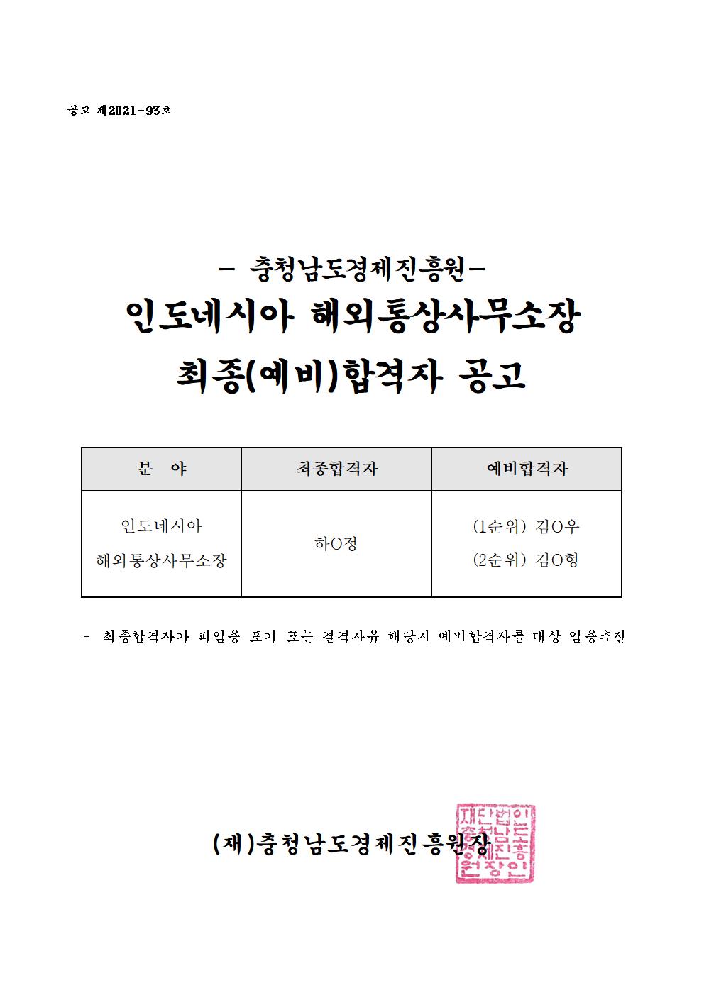 | 2021년 인도네시아(자카르타) 해외통상사무소장 최종(예비)합격자 공고 |