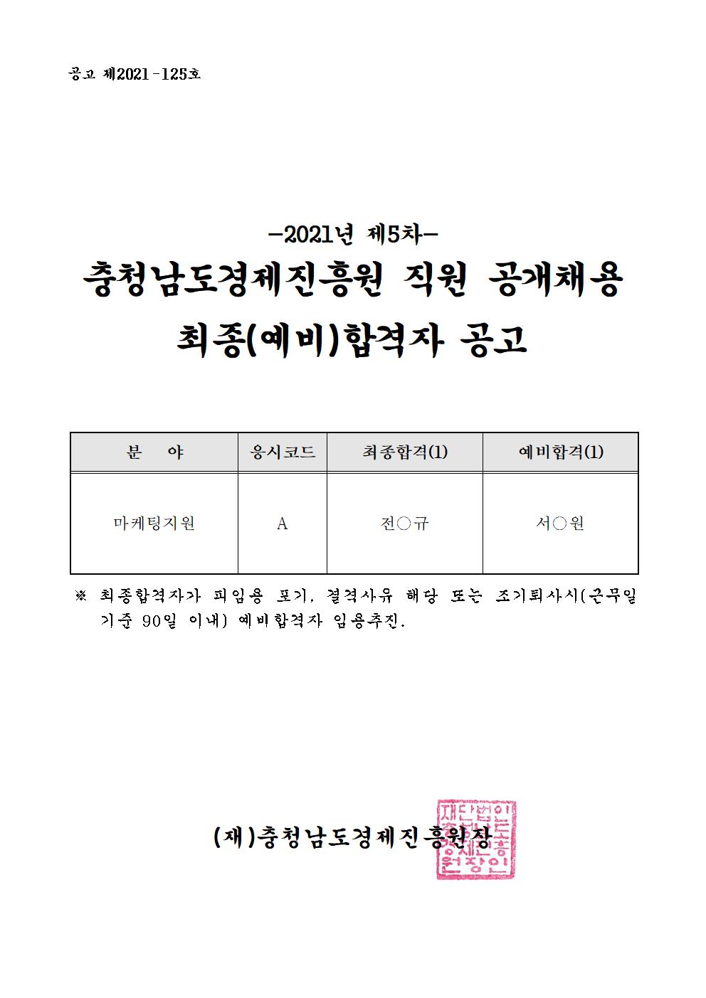 2021년 제5차 직원채용(정규직) 최종(예비)합격자 공고