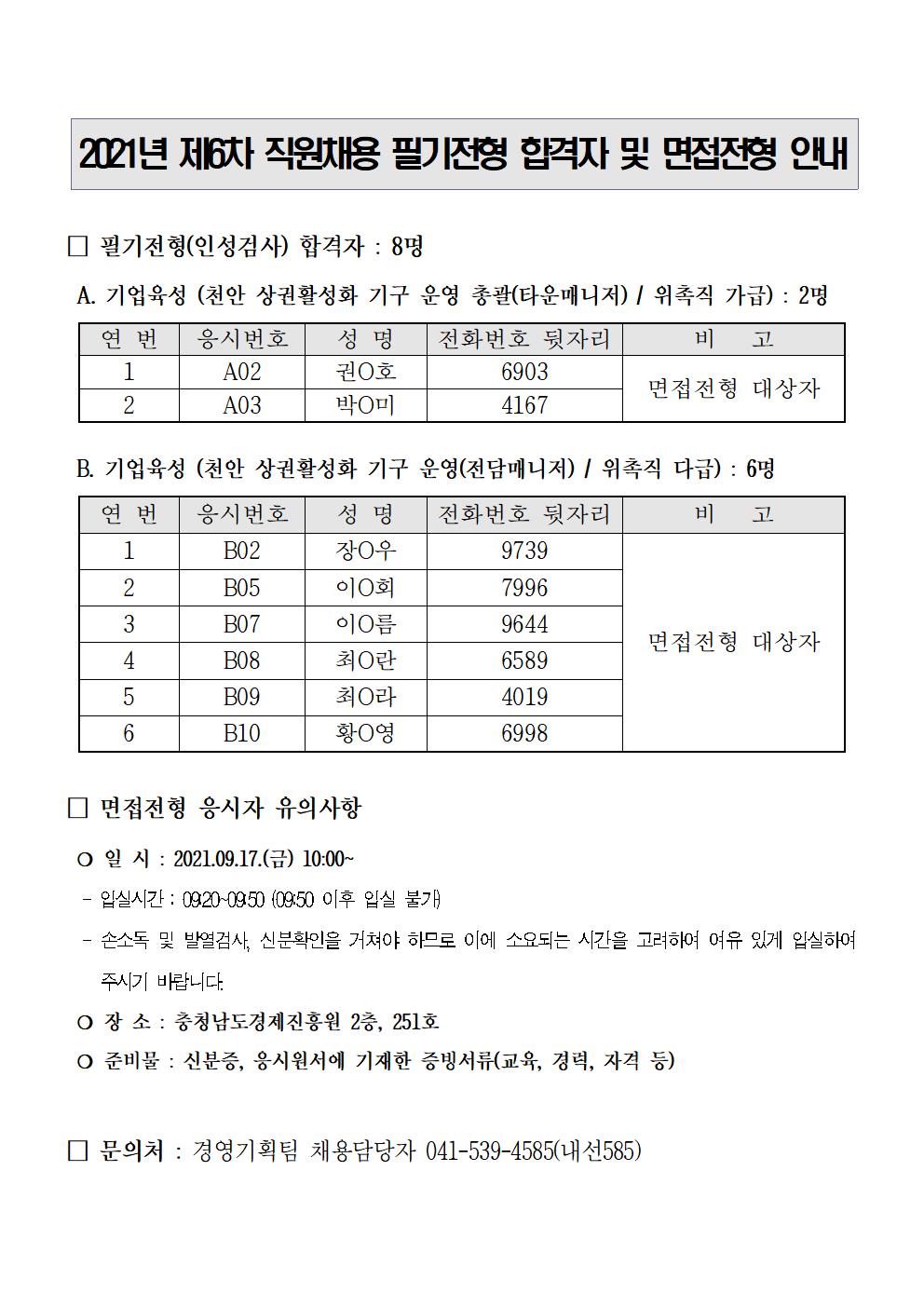 | 2021년 제6차 직원채용(계약직) 필기전형 합격자 및 면접전형 안내 |