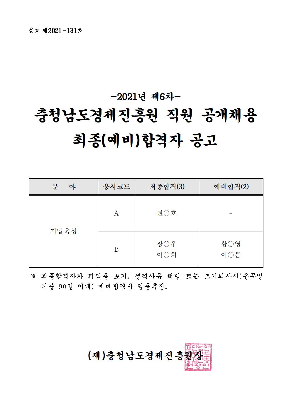 2021년 제6차 직원채용(계약직) 최종(예비)합격자 공고
