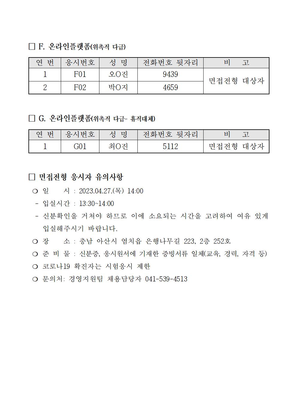 | 2023년 제1차 직원채용(계약직) 필기전형 합격자 및 면접전형 안내 |