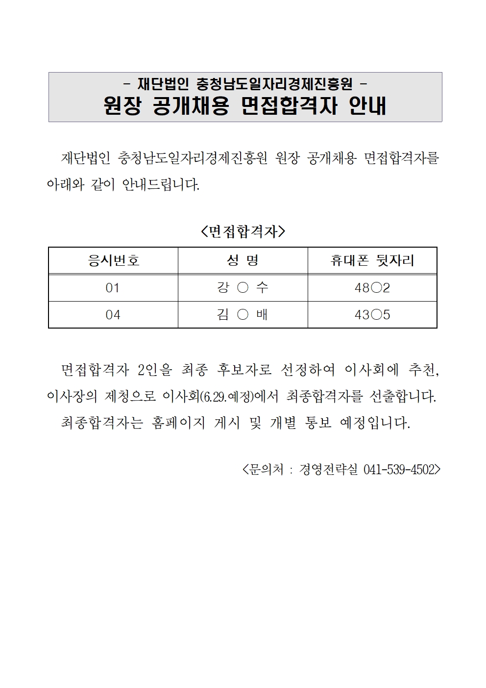 (재)충청남도일자리경제진흥원 원장 공개채용 면접합격자 안내
