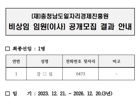 (재)충청남도일자리경제진흥원 비상임임원(이사) 공개모집 결과 안내