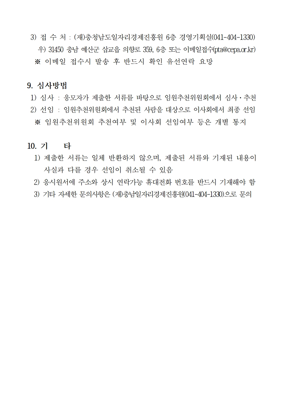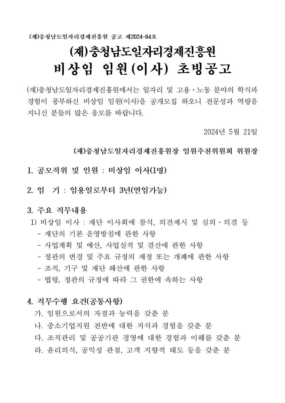 | (재)충청남도일자리경제진흥원 비상임이사 모집 공고 [일자리 및 고용·노동 분야] |