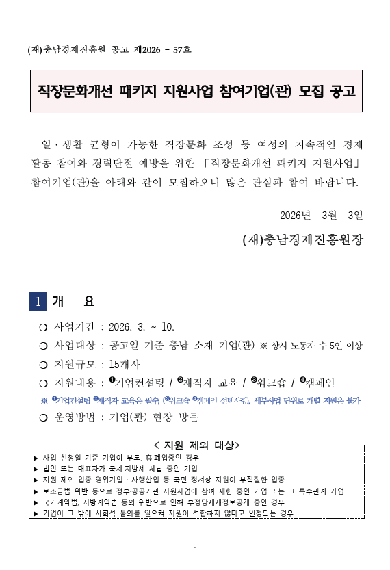 | 2026년 직장문화개선 패키지 지원사업 참여기업(관) 모집 공고 |