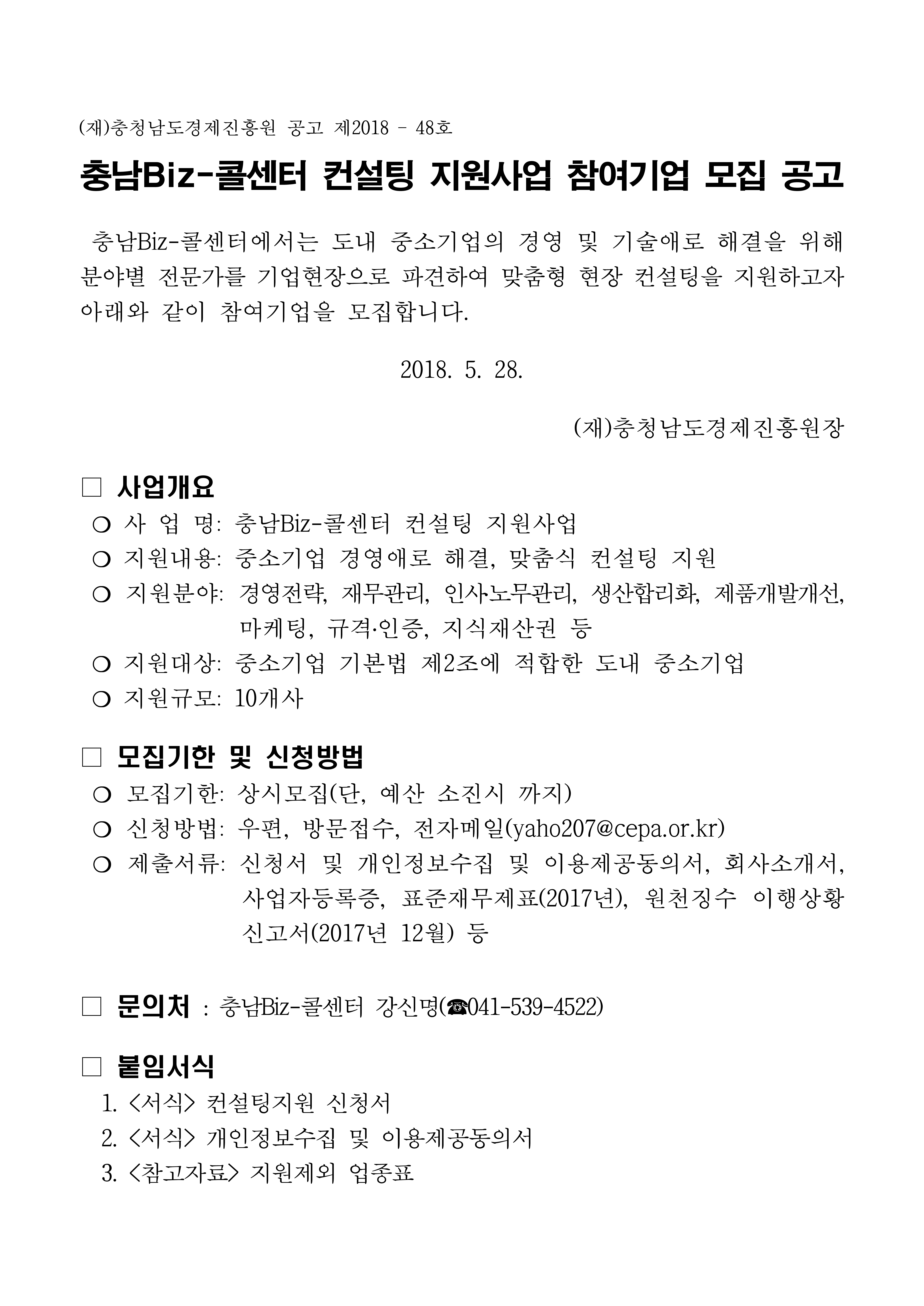 | 충남 비즈콜센터 컨설팅 지원사업 참여업체 모집 (공고) |