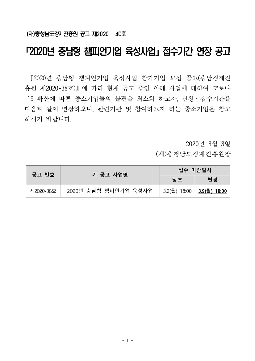 | 2020년 충남형 챔피언기업 육성사업 접수기간 연장 공고 |