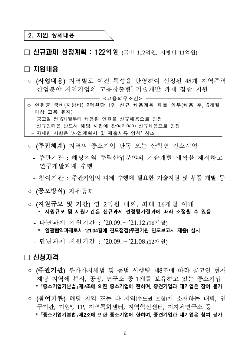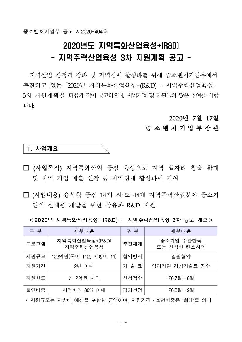 | 2020년도 지역특화산업육성+(R&D) - 지역주력산업육성 3차 지원계획 공고 - |