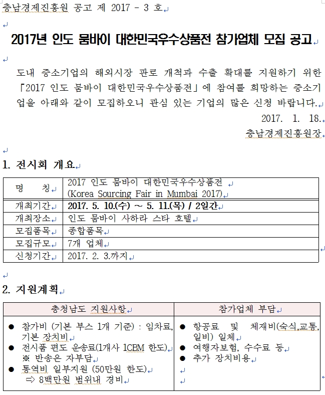 | 2017년 인도 뭄바이 G-fair(대한민국우수상품전) 참가업체 모집공고 |