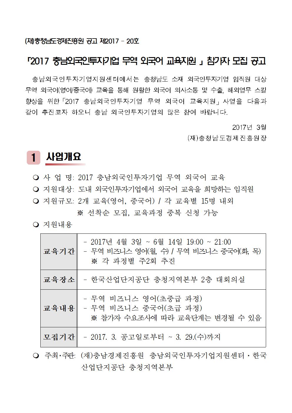 | 2017 충남외국인투자기업 무역 외국어 교육 참가자 모집 공고 |