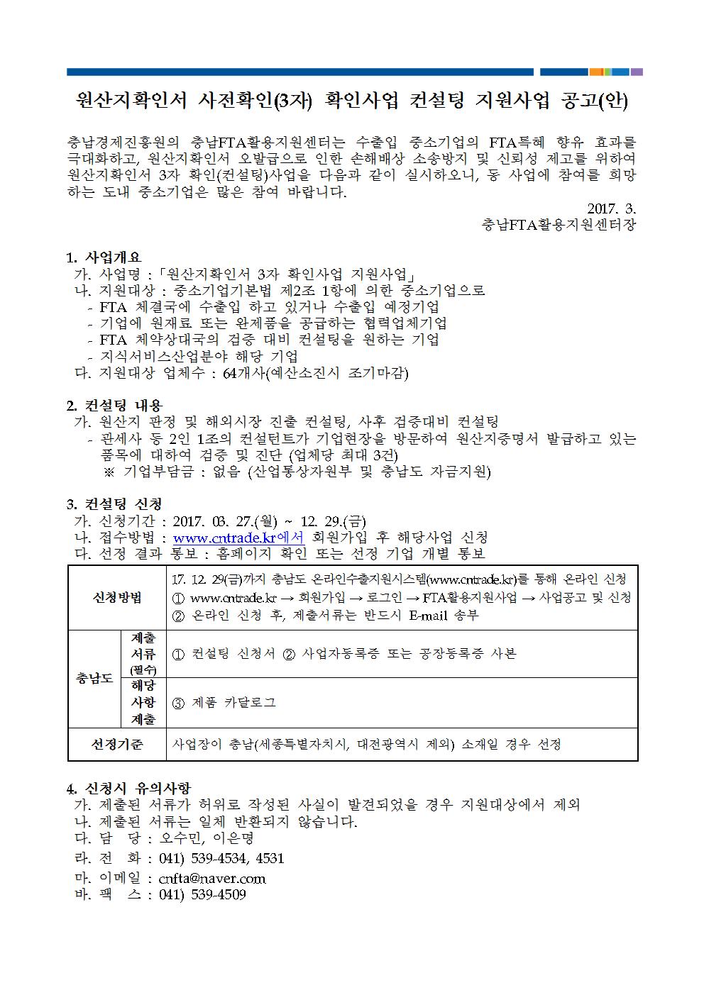| 2017 FTA 원산지확인서 사전확인(3자) 확인사업 컨설팅 지원사업 신청 안내 |