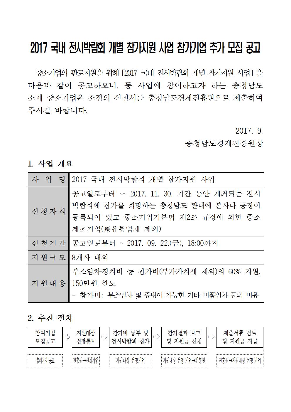 | 2017 국내 전시박람회 개별 참가지원 사업 추가 모집공고 |