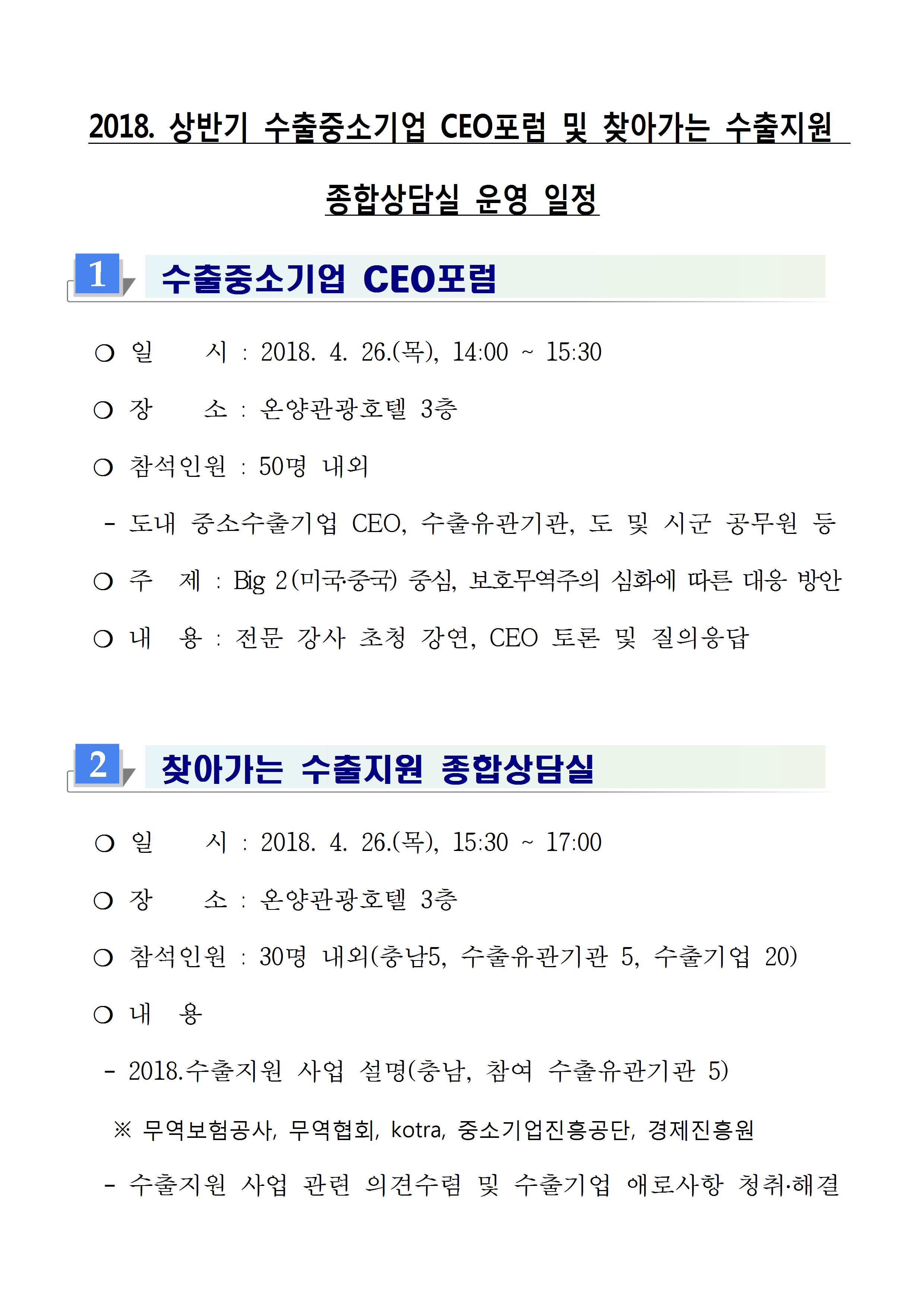 | 2018 상반기 수출중소기업 CEO 포럼 및 찾아가는 수출지원 상담실 운영 참가자 모집공고 |