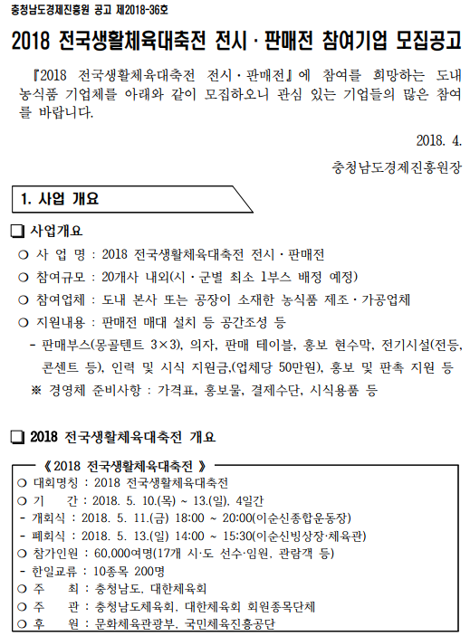 | 2018 전국생활체육대축전 전시판매전 참여기업 모집 |