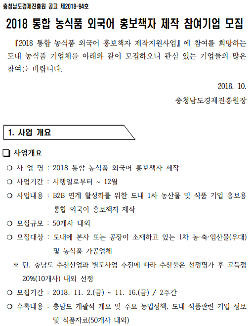 | 2018 통합 농식품 외국어 홍보책자 제작 참여기업 모집의 건 |