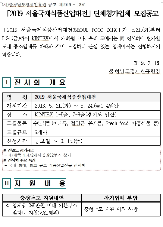 | '2019 서울국제식품산업대전' 단체참가업체 모집공고 |