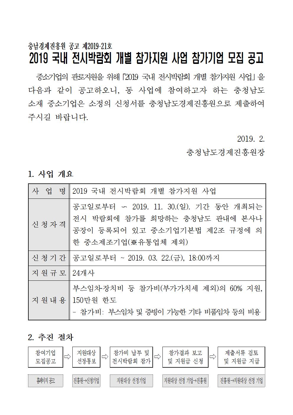 | 2019년 국내 전시박람회 개별 참가지원 사업 참가기업 모집 공고 |