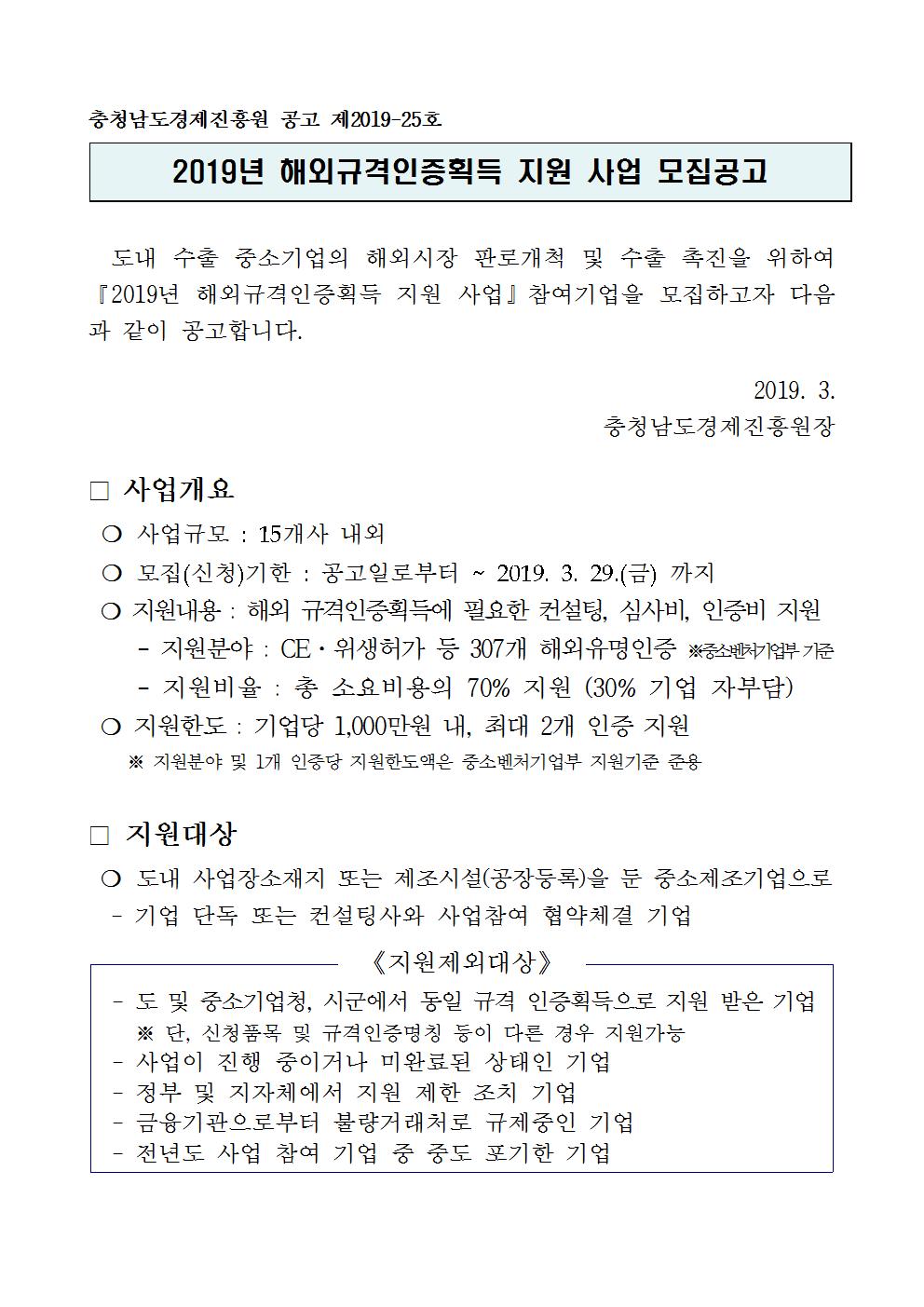 | 2019년 해외규격인증획득 지원사업 모집공고 |