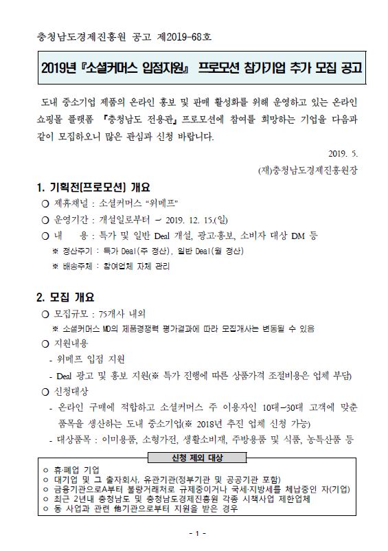 2019년 소셜커머스 입점지원 프로모션 참가기업 추가 모집공고