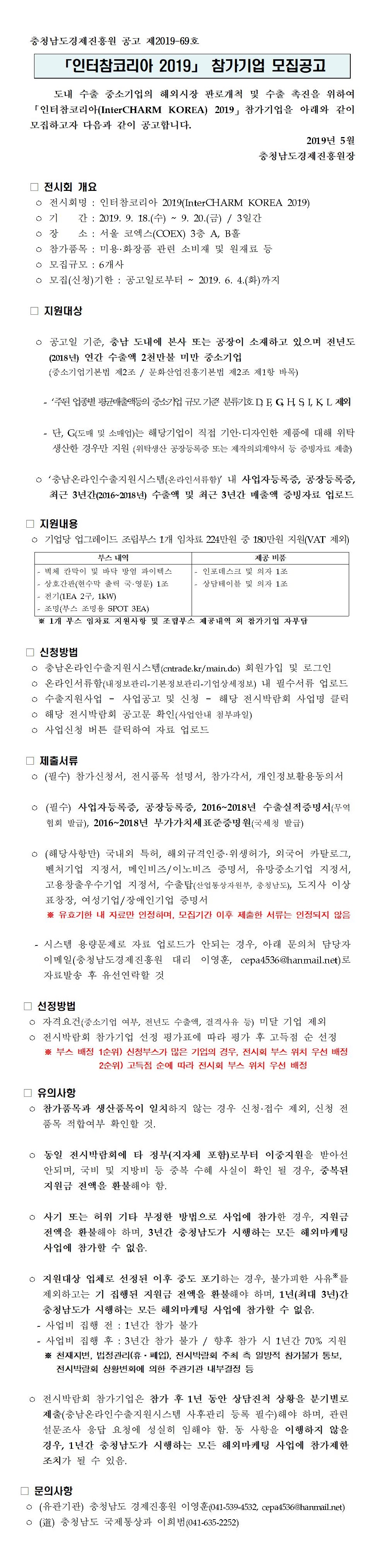 | 모집안내 인터참코리아 2019 단체참가지원 참여기업 모집 안내 |