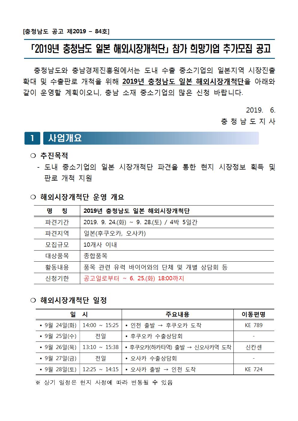 | 2019년 충청남도 일본 해외시장개척단 참가 희망기업 추가모집 공고 |