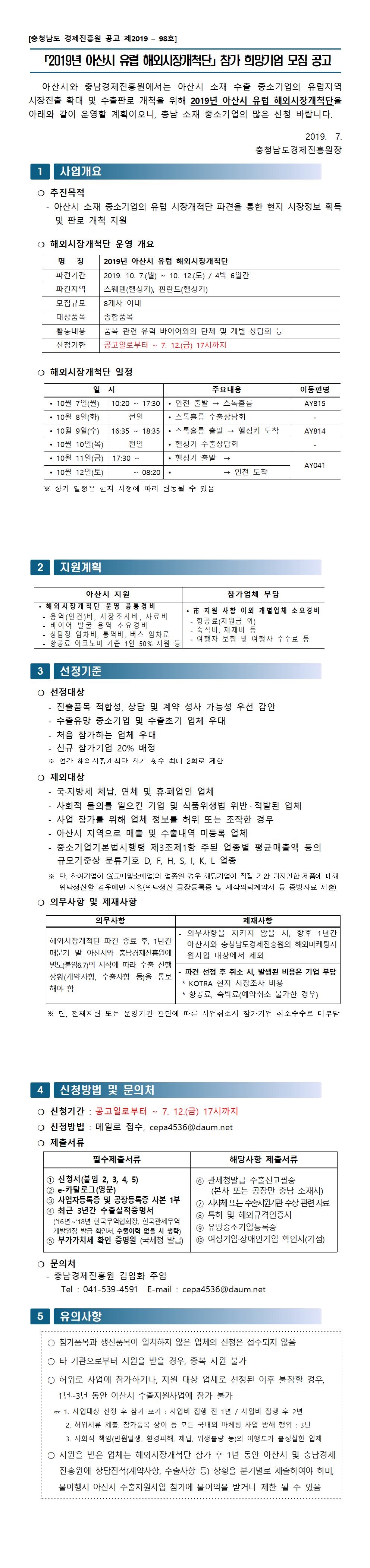 | 「2019년 아산시 유럽 해외시장개척단」참가 희망기업 2차 추가모집 공고 |