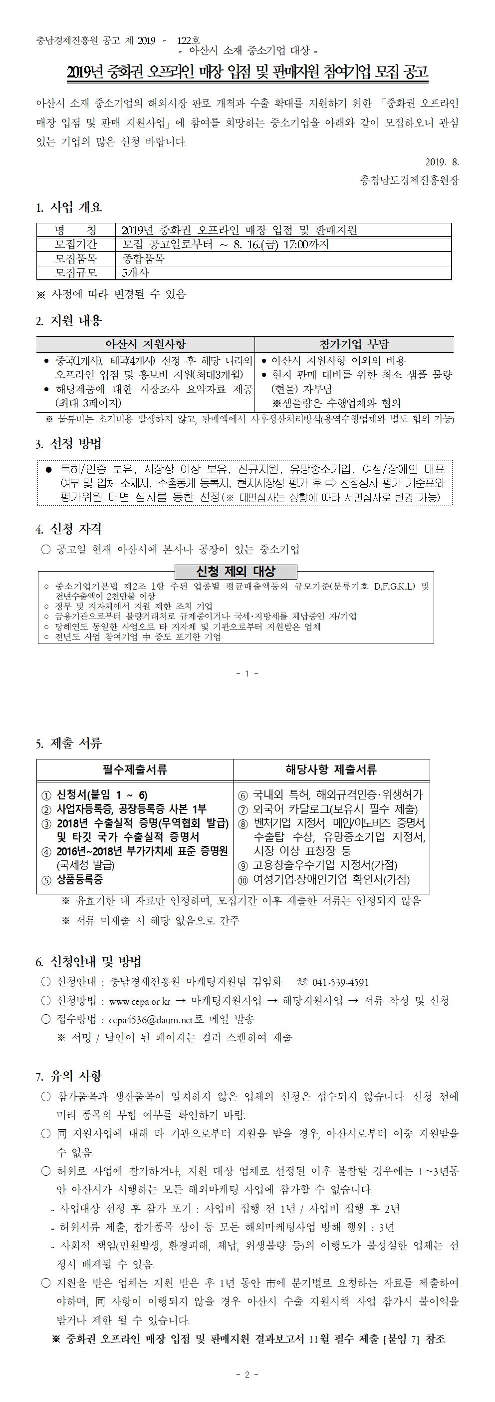 | 2019년 중화권 오프라인 매장 입점 및 판매지원 참여기업 추가 모집 공고 |